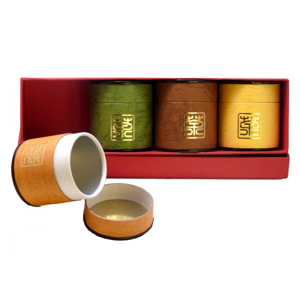 Coffret de 4 petites boîtes à thé chinoises d'une contenance de 25g chacune, en carton, avec motif chinois.
