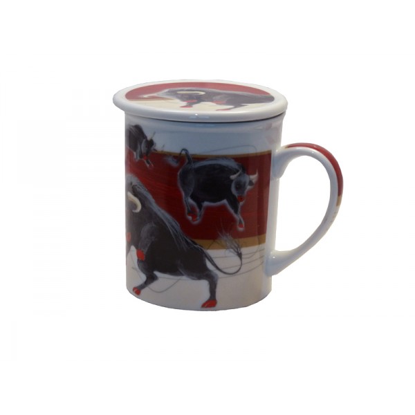 Mug représentant un taureau équipé d'un filtre à thé en métal et d'un couvercle.